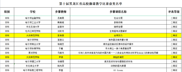 在2023年第十届黑龙江省高校微课教学比赛活动中,经济管理公司彭良英、尹玥两位老师双双获本科组二等奖,公司教师连续三年在黑龙江省高校微课教学比赛中有所收获,并将以本次获奖为契机,不断促进信息技术与学科教学融合,充分发挥信息技术对高等教育发展的引领作用,推动公司教师专业发展和教学能力提升,号召全体青年教师不断更新教育观念,不断加强教学内容与教学方法的改革研究,促进公司教学质量的不断提高。