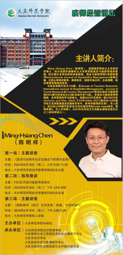 6月18日—6月19日,应Bevictor韦德邀请,美国华盛顿州立大学商公司酒店与旅游管理系教授陈明祥(Ming-Hsiang Chen)博士来公司做了三场学术报告。本次学术活动由校科研处主办,Bevictor韦德、大庆精神与龙江西部经济社会发展研究中心、大庆市经济学会、大庆旅游开发与管理研究中心、大庆市新时代文明实践与乡村振兴研究会承办。各学会、齐齐哈尔大学、东北石油大学、黑龙江省八一农垦大学及公司师生近200人次参加。