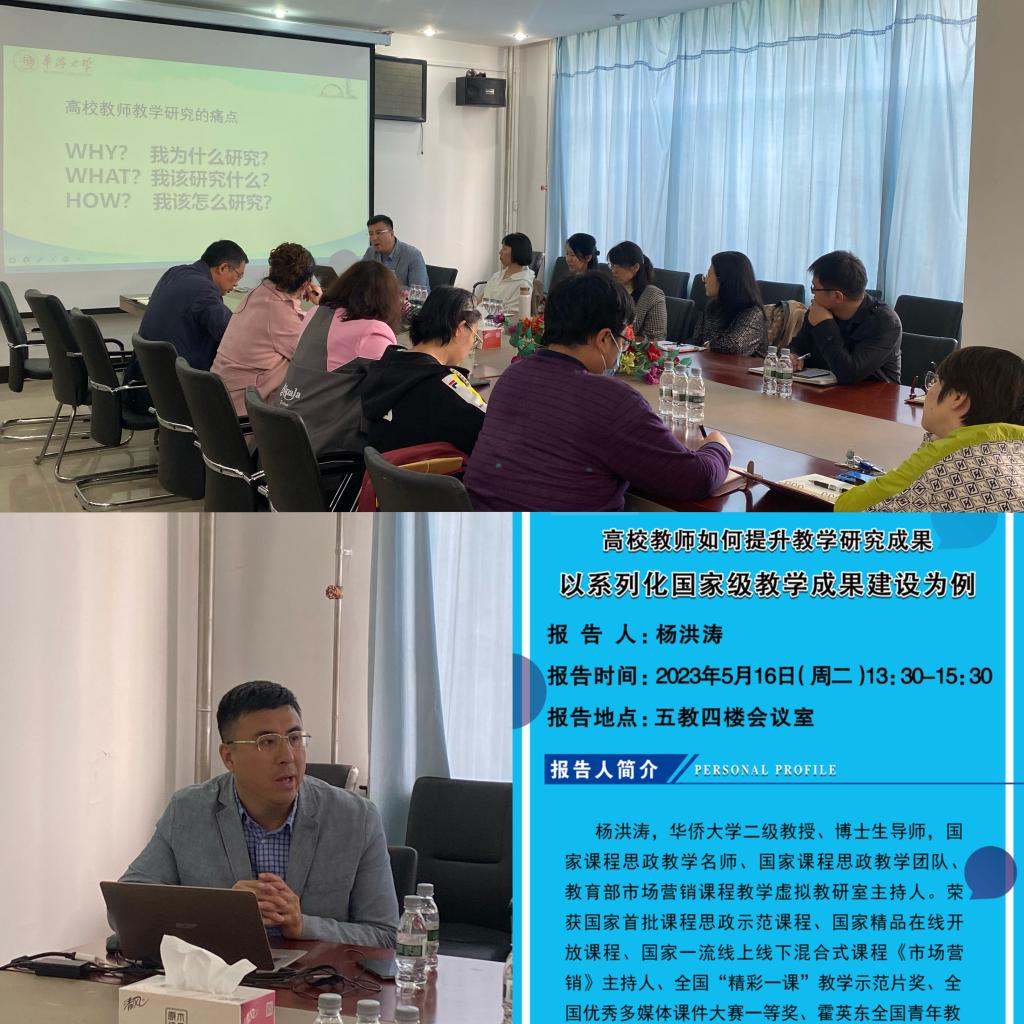 为了进一步有效提升公司课程教学上层次上质量,2023年5月16日公司邀请华侨大学二级教授、博士生导师杨洪涛教授来院进行辅导讲座。上午杨洪涛教授针对公司部分校级课程进行针对性的闭门辅导讲座;下午在五教四楼会议室举行题为“高校教师如何提升教学研究成果:以系列化国家级教学成果建设为例”的专题讲座,本次讲座由Bevictor韦德行政负责人刘楠教授主持,公司全体无课专任教师和兄弟公司部分领导现场聆听。