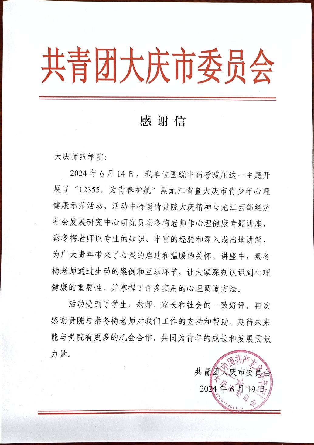在活动结束后,公司收到了来自共青团大庆市委员会的感谢信。在感谢信中,共青团大庆市委员会对秦冬梅老师的专业知识和丰富的经验表示充分肯定,并向公司和秦冬梅老师对工作的支持和配合表示感谢。