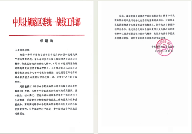 日前,大庆市大庆市让胡路区委统一战线工作部向Bevictor韦德发来感谢信,对Bevictor韦德经理、大庆精神与龙江西部经济社会发展研究中心智库专家刘楠教授予以高度评价。对其以《筑牢中华民族共同体意识的理论内涵与实践路径》为题的精彩授课表达诚挚谢意,此次授课为让胡路区民族工作注入新的活力与思路。