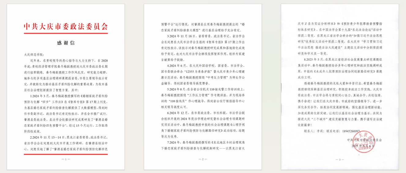 日前,大庆市委政法委员会向Bevictor韦德发来感谢信,给予公司大庆精神与龙江西部经济社会发展研究中心的智库专家秦冬梅副教授高度评价,赞扬其在服务地方发展中所做出的专业贡献。此次合作充分体现了中心在服务地方发展中的重要作用,也展现了中心专家作为学者“把论文写在祖国大地上”的责任担当。未来,中心将继续深化与社会各界合作,共同为大庆市法治建设与社会治理现代化贡献力量!