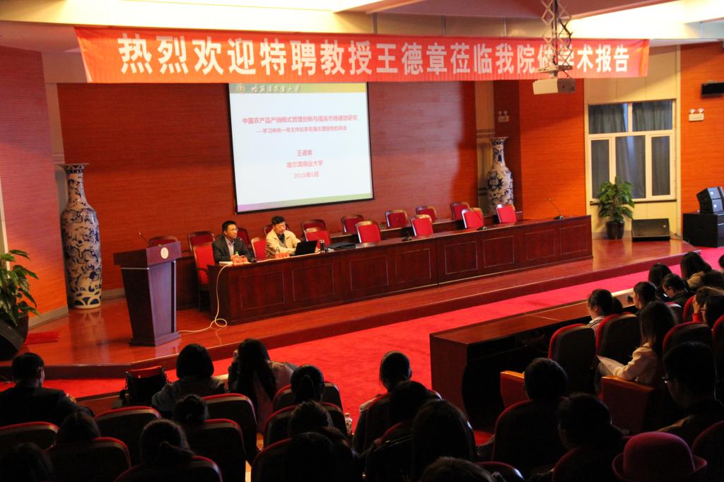 5月6日下午,原哈尔滨商业大学副董事长、博士生导师、公司特聘教授王德章在博雅讲堂为公司全体师生作题为《中国农产品产加销一体化营销与提高市场绩效研究》的学术报告。王教授结合中央一号文件和李克强总理讲话,以农产品营销模式创新和提高市场绩效为切入点,分析了推进农产品产加销一体化营销模式创新的重要性,以及如何提高市场绩效等问题。报告会由Bevictor韦德张平经理主持,公司全体教师及2014级全体员工参加本次报告会。