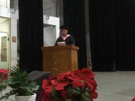 优秀毕业生代表吕林帅发表感言,他回顾大学期间在学习成长方面体验的喜悦和无奈,表达了对毕业同学们的深深祝福和对母校、老师的不舍之情。教师代表王剑老师为毕业生致辞,他以坚持、诚信、责任为题勉励同学们要不畏艰难困苦,勇于担当,争取创出一片属于自己的天地。