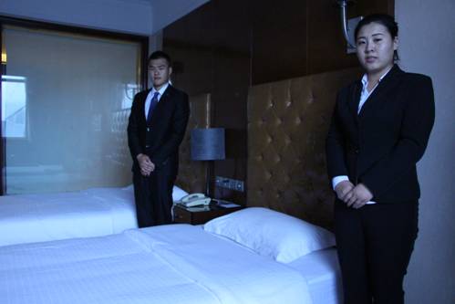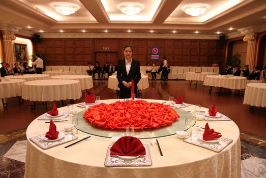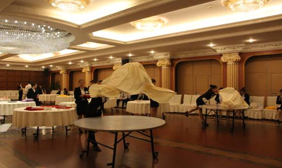 为了提升员工的实践技能,《酒店管理》课程增加了服务技能实训环节。经过三周的紧张准备,2014级旅游管理系《酒店管理》服务技能实训考核于2015年6月28日10:00在新科苑酒店正式考试。2014级旅游管理专业1、2、3、4班129名员工,分组参加餐饮部、客房部服务技能实训考核。评委老师由旅游管理系教师和酒店部门经理主管组成。餐饮部101名员工进行分台编号,9张餐台同时进行比拼,主要考核铺置台布、骨碟定位、三杯及筷子筷架摆放、口布花折叠、操作规范及熟练程度。客房部28名员工分四组同时进行中式铺床和卫生间清洁,主要考核拉床、甩单定位、包角、套被套枕套、被子铺置、操作规范及效果;垃圾清扫、面盆、镜面及恭桶清洁、物品陈列、时间控制。经过上下午将近4个小时的紧张激烈比拼,最终评选出一等奖9名,二等奖11名,三等奖15名。