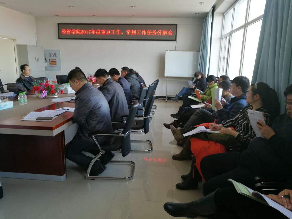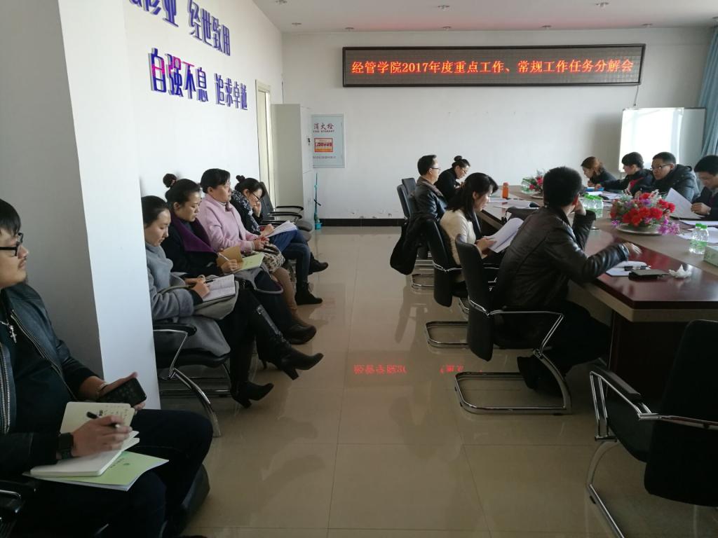 会上,首先由办公室主任刘萍逐条宣读了公司各部门2017年度重点工作内容。2017年重点工作包括133项工作,涉及教学、科研、督导与团队、党建、员工管理、办公室、大庆市经济学会、实验实训中心以及市场营销系、财务管理系、旅游管理系12个部门。