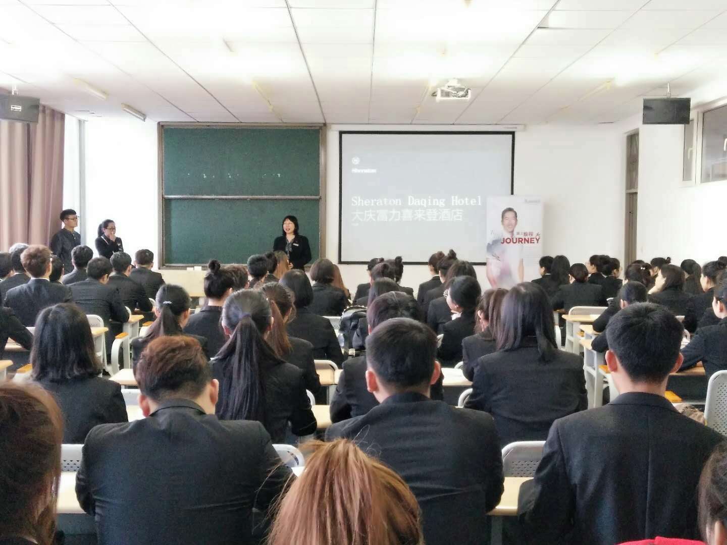 2018年3月28日下午13:30分,公司旅游管理系邀请大庆富力喜来登酒店人力资源总监叶欣入校进行实习宣讲,向同学们介绍酒店的内部组织机构以及招聘实习岗位、福利待遇等。