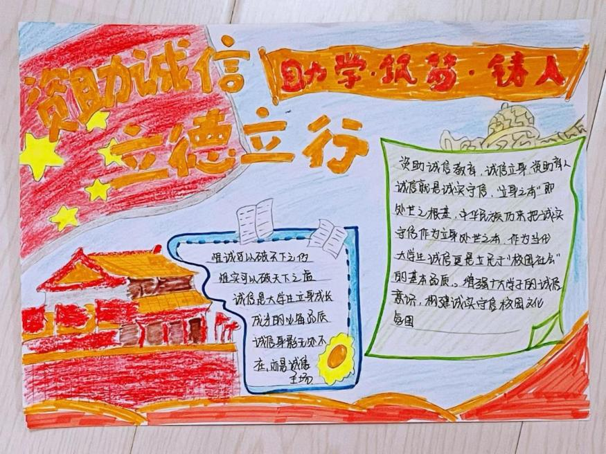 活动作品以文字和图画相结合的方式,从不同角度展现自己的内心世界,表达了对诚信与感恩的认识与感悟。