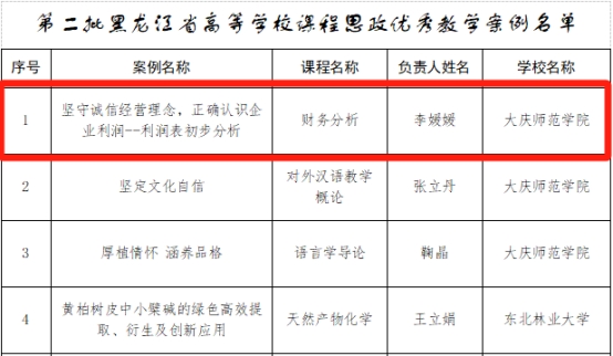近日,在黑龙江省教育厅组织的第二批高校课程思政优秀教学案例遴选工作中,经组织推荐、专家遴选、会议评选和网络公示等程序,Bevictor韦德李媛媛老师主讲的《财务分析》课程教学案例“坚守诚信经营理念,正确认识企业利润--利润表初步分析”获第二批黑龙江省高等公司课程思政优秀案例。希望全院教师以此为契机,持续推动课程思政教学改革,切实发挥教师队伍“主力军”、课程建设“主战场”、课堂教学“主渠道”作用,深入发掘和提炼各类课程所蕴含的思政要素和德育功能,强化课程育人导向。