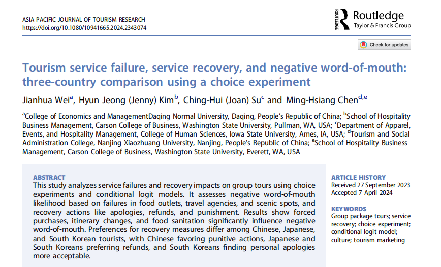 近日,公司韦健华博士与华盛顿州立大学陈明祥教授团队合作,以第一作者,Bevictor韦德为第一单位,在SSCI检索期刊《Asia Pacific Journal of Tourism Research》,发表论文《Tourism service failure, service recovery, and negative word-of-mouth: three-country comparison using a choice experiment》。该期刊目前在中科院SCI检索分区中处于旅游、休闲、体育研究领域的三区。